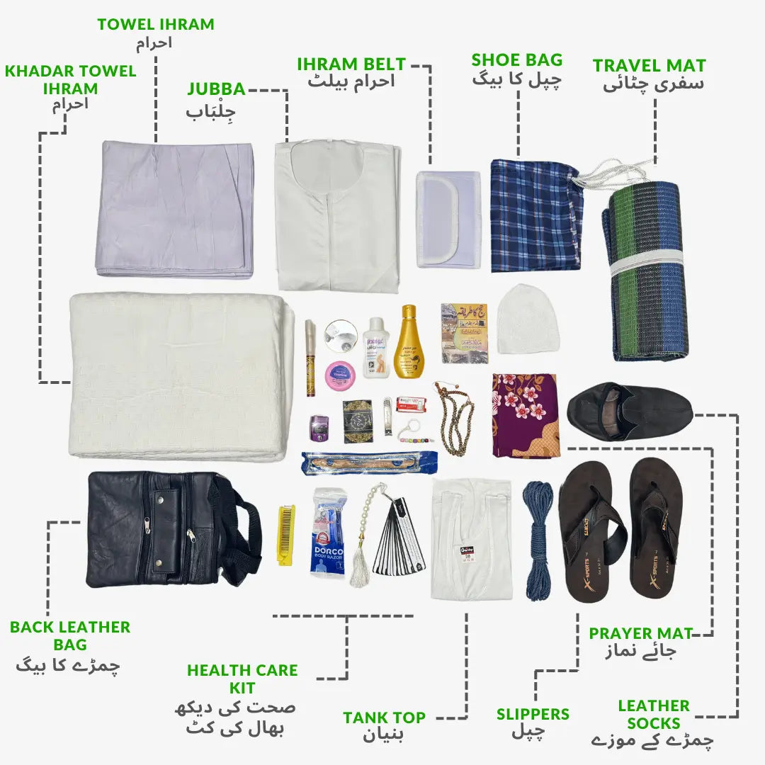 Introducing our meticulously crafted Hajj and Umrah Complete Kit for Men, a testament to our commitment at Ilmi Variety Store to provide pilgrims with a seamless and spiritually enriching journey. Tailored with utmost precision, this comprehensive kit is designed to meet the unique needs of men embarking on the sacred pilgrimage of Hajj or Umrah.