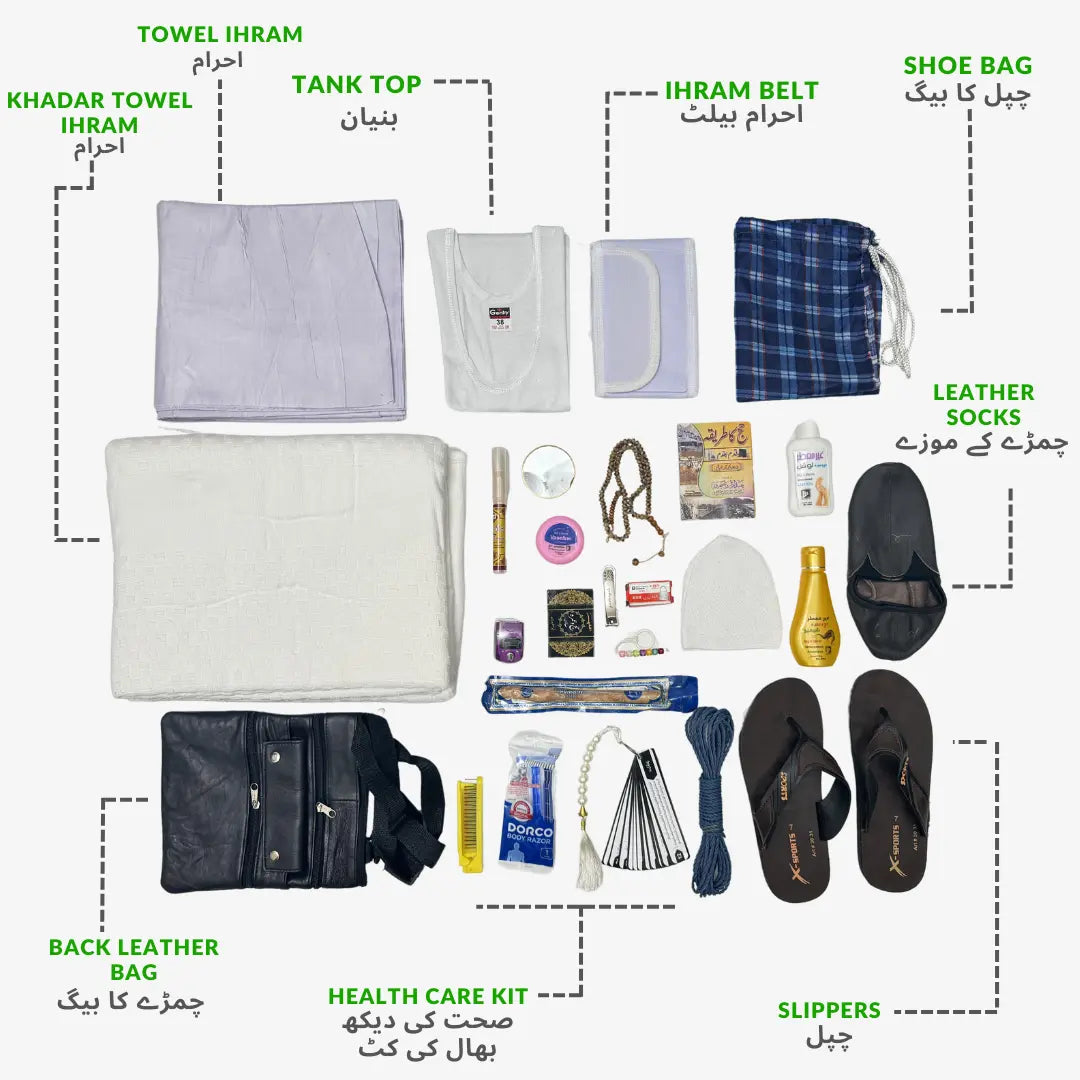 Introducing our meticulously crafted Hajj and Umrah Complete Kit for Men, a testament to our commitment at Ilmi Variety Store to provide pilgrims with a seamless and spiritually enriching journey. Tailored with utmost precision, this comprehensive kit is designed to meet the unique needs of men embarking on the sacred pilgrimage of Hajj or Umrah.